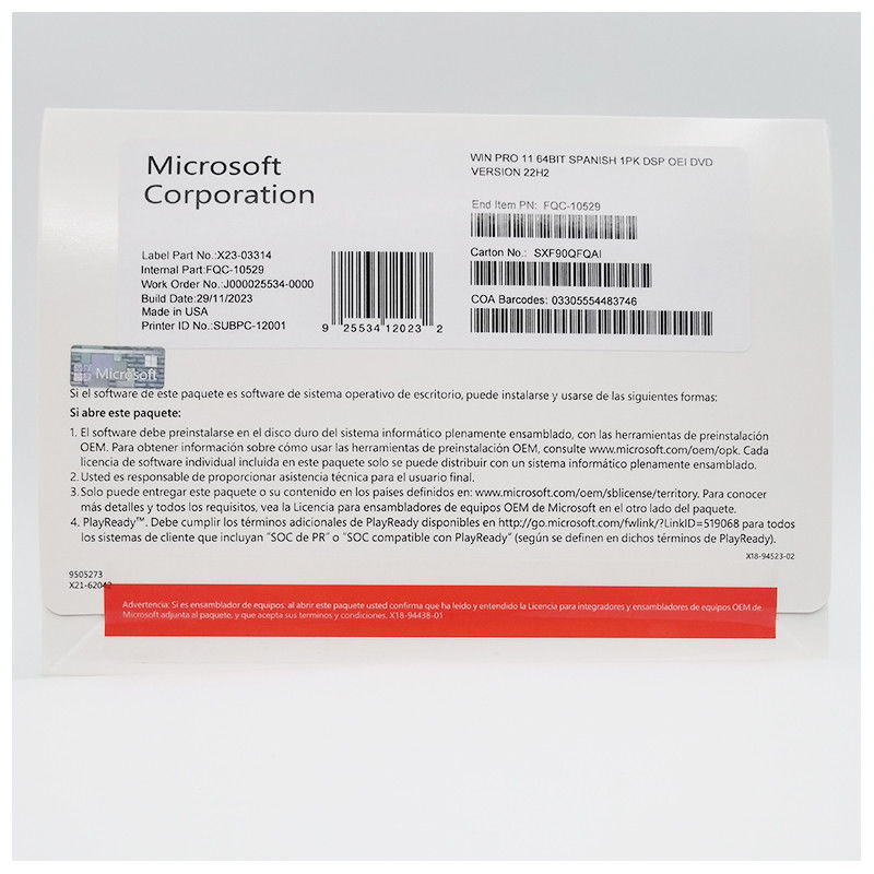 Auténtico Windows 11 Pro OEM CD Key incluido en el paquete de español